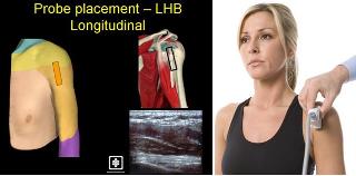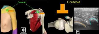 El coracoides es el faro al hombro y el punto de referencia para comenzar. La sonda se coloca en la coracoides en dirección horizontal, perpendicular a la cabeza larga del bíceps.