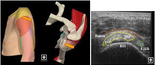 Luego, la sonda se cambia nuevamente a la posición horizontal, lo que brinda una vista longitudinal del músculo y el tendón del subescapular a medida que se inserta en la tuberosidad menor del húmero. El tercio superior del subescapular es más tendinoso y las inserciones de los dos tercios inferiores son musculares. Los desgarros del subescapular generalmente comienzan en la parte superior y avanzan en la parte inferior, por lo tanto, la porción tendinosa debe identificarse primero y fácilmente. El brazo se puede rotar interna y externamente para mejorar la visualización del tendón y el músculo subescapular. Luego, la sonda se gira 90° para obtener una vista transversal del subescapular y la sonda se mueve medial y lateralmente para obtener una impresión de la unidad musculotendinosa.