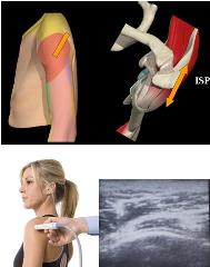 El brazo del paciente se lleva hacia atrás a su lado con el antebrazo sobre su regazo. El manguito posterior/inferior (infraespinoso y redondo menor) se encuentra debajo de la espina de la escápula en la parte posterior. Se puede palpar la espina de la escápula y colocar la sonda en dirección longitudinal justo debajo de la espina de la escápula. La sonda se mueve lateralmente para ver la superficie articular glenohumeral posterior y la inserción del infraespinoso y el redondo menor en el húmero. El brazo se puede girar para mejorar la visualización de esta zona. El redondo menor tiende a adherirse a un tubérculo prominente en la parte posterior del húmero que se puede ver en la vista transversal que ayuda a delinear el infraespinoso del redondo menor.La lesión de Hill Sachs, es decir, las fracturas por compresión con dislocación de la cabeza humeral posterior, a veces se pueden ver y medir en la ecografía subyacente al manguito posterior.