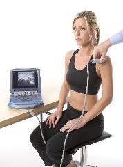 – El paciente se enfrenta a la pantalla con el examinador de pie o sentado en el lado del hombro a escanear. Luego, el paciente se incluye en el examen y el examinador puede discutir los hallazgos y escanear con el paciente manteniéndolo involucrado durante el procedimiento.